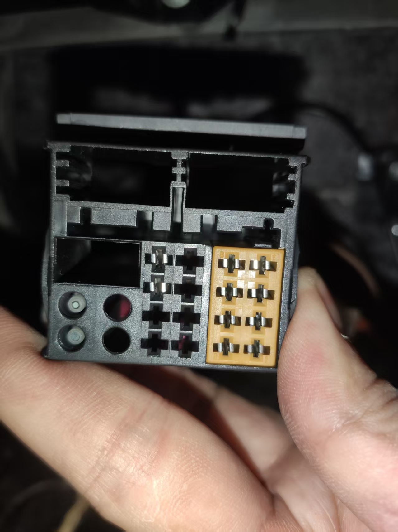 从主机尾插基本就可以确定,买到的AUX连接线就是插在右上角的那个孔里的,因为上面的两个孔洞原车并未接入任何端子,如下: